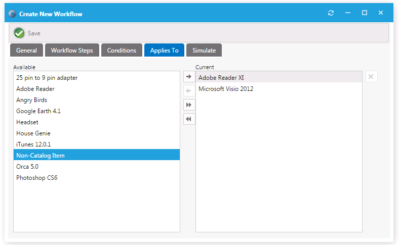 18. Open the Applies To tab, which you can use to identify which catalog items that this workflow applies to.