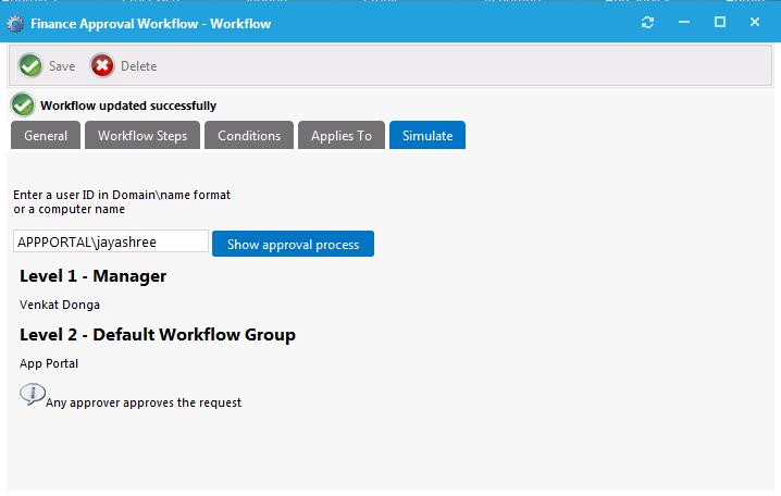 20. Open the Simulate tab, on which you can enter a user ID or a computer name so that you can simulate the approval process for that user or computer.